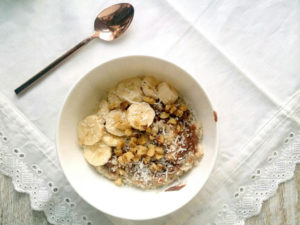 Chocolate Peanut Butter Oatmeal with Coconut, Walnuts and Bananas