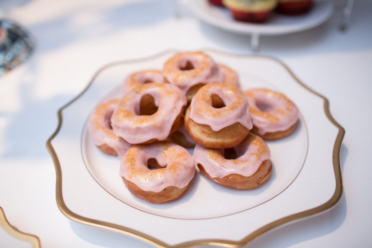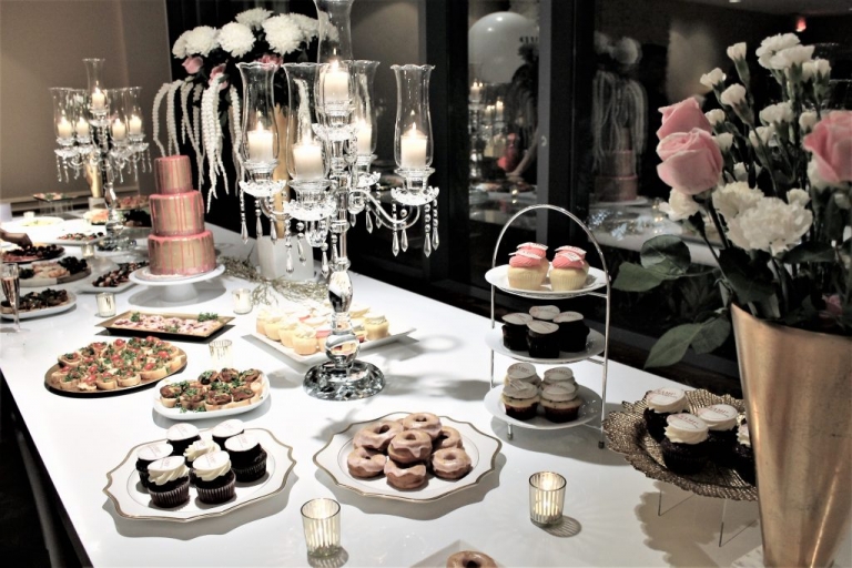 Champagne flutes were served and guests were offered a spread of delicious appetizers and treats catered by MealsAWeight. Assorted cheese plates, canapés, pretty cupcakes designed with the studio name, a gorgeous gold and pink cake all arranged amongst beautiful floral arrangements and crystal candelabras.
