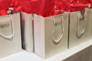 The event was held in a separate room through the back door and across a peaceful courtyard. Pretty white gift bags with pink tissue paper lined the welcome table as you entered and I was definitely intrigued to dig through one but felt it was better to save them for the guests!
